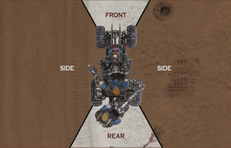 Every hit a vehicle suffers is resolved against one of these 'facings'. Which facing has been hit depends upon where the attacking model is in relation to the vehicle. To determine this, imaginary lines are drawn from the vehicle, as shown in the diagram; whichever arc the centre of the attacking model's base (or central hole in the case of a Blast marker) is in is the facing hit.